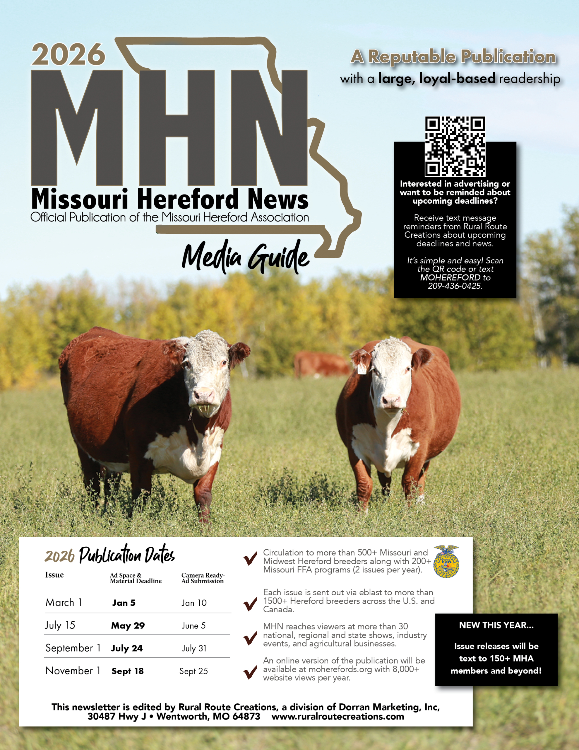 The Missouri Hereford News is the official publication of the Missouri Hereford Association. It is published four times a year by editors Cassie Dorran and Jocelyn Washam.